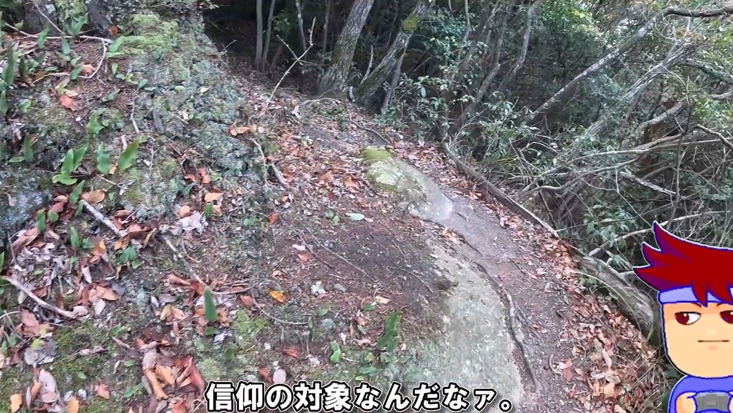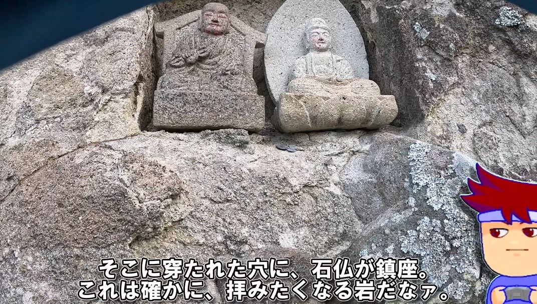 ゴツゴツした岩を乗り越えながら進んだ先にはタケノコのような大きなシンボリックな岩が。こちらにも石仏が鎮座していて、「拝みたくなる岩だなぁ」と手を合わせます。