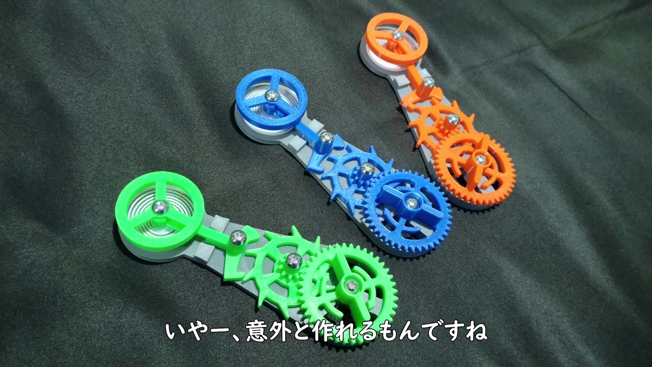 3Dプリンターで部品を印刷します。一番心配だったのはヒゲゼンマイ。適当な寸法と一般的な樹脂でうまくいくのか不安でした。ですが、実際に印刷した物を触ってみると、意外によくできていました。