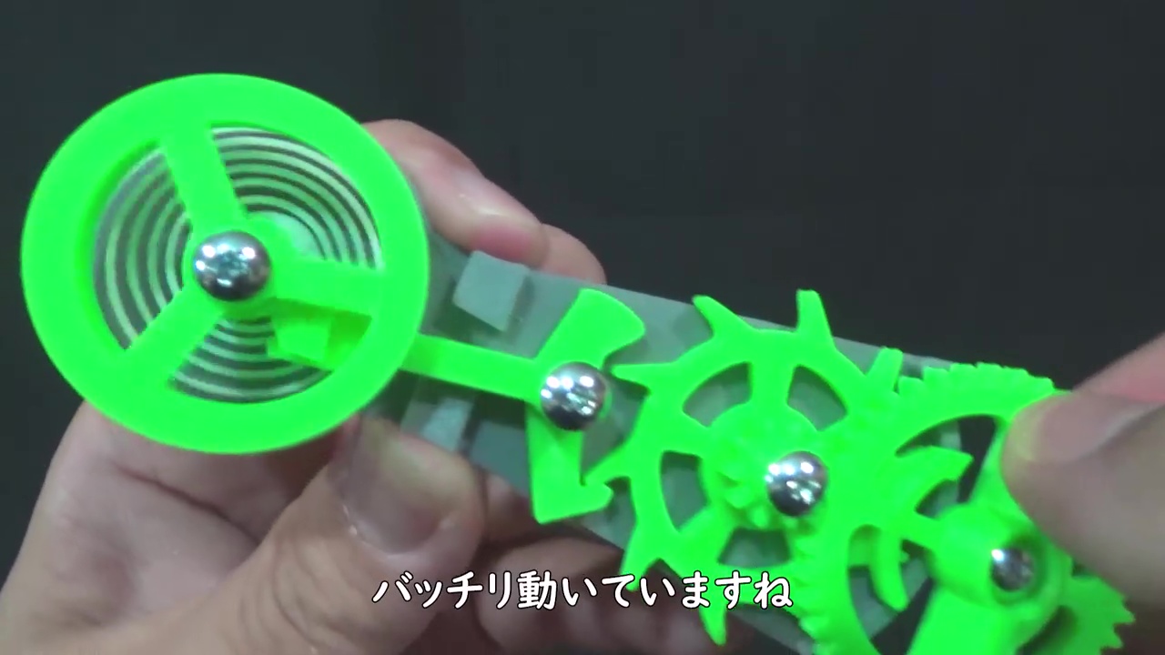 組み立てて、実際に動作させてみます。今回のモデルは学習用なので、動力源はありません。手で大歯車を回すと、カチカチと機械式時計のような音がして、軽快に回り始めました。腕をうまく回していけば自重で動作し続けるので、無限に遊ぶことができます。