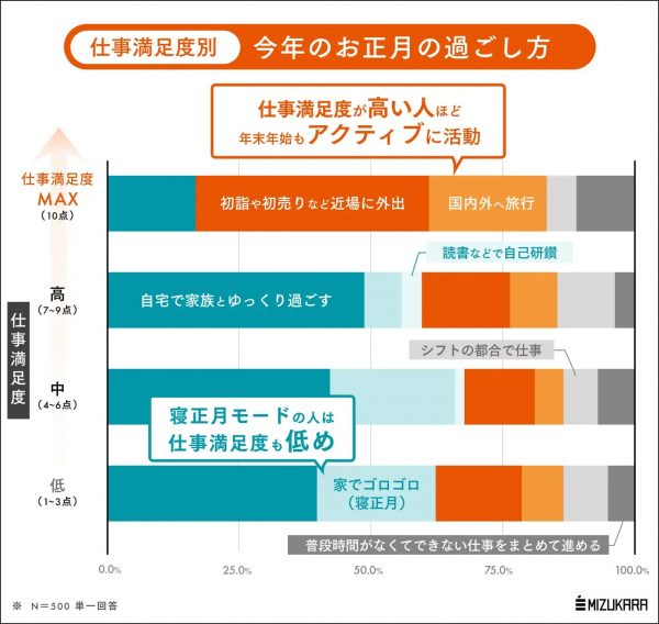 一方で寝正月モードの人は仕事満足度も低い傾向が見られました。