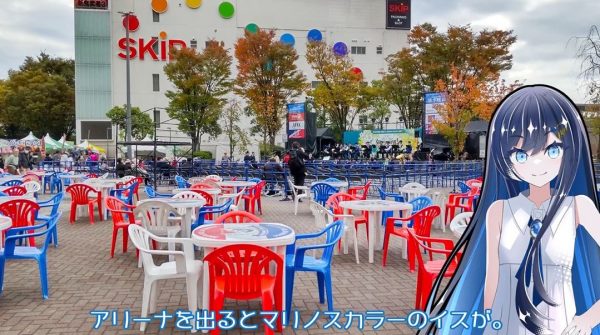 アリーナを出るとマリノスカラーの椅子が。万博目線で見ると、トリコロールがミャクミャクカラーにも見えてきます。