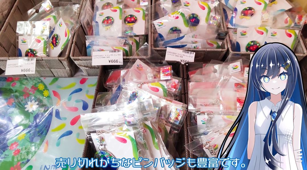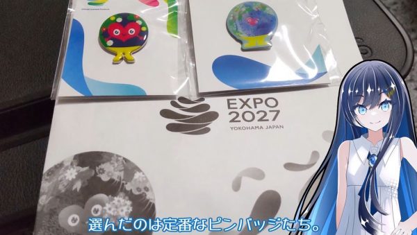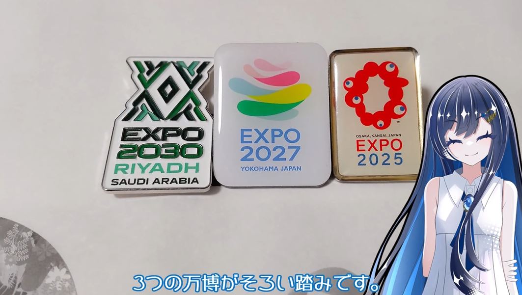 みすいぶさんはピンバッジを購入し、3つの万博のロゴをそろえることができました。
