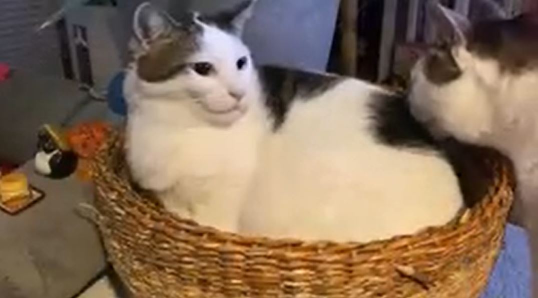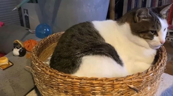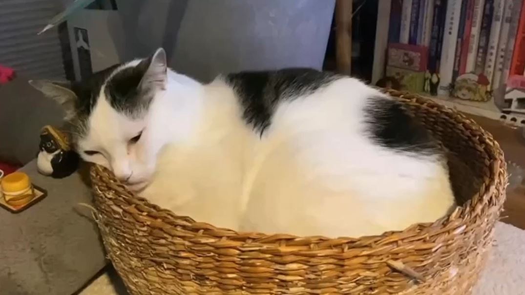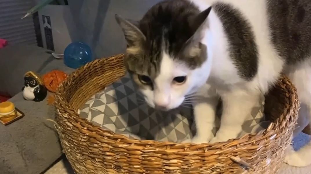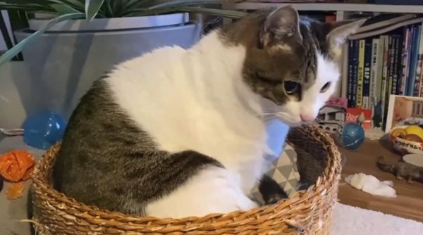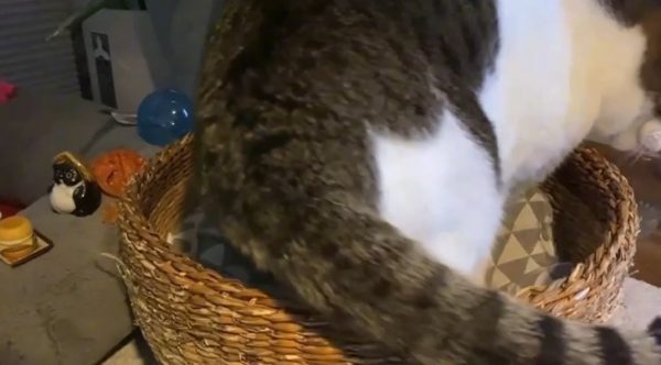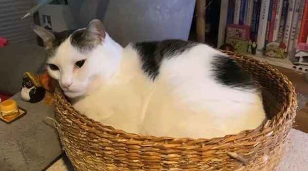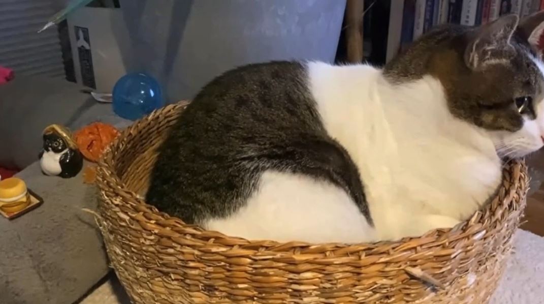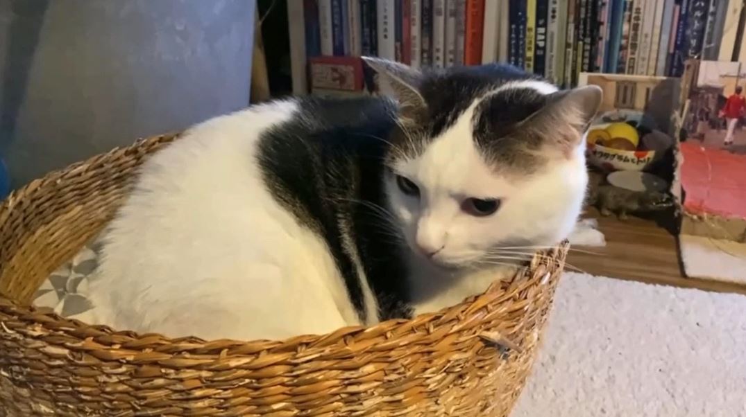 ハチワレ猫のオクタグラムちゃんが寝ているのは、この家の超人気スポットだというカゴです。