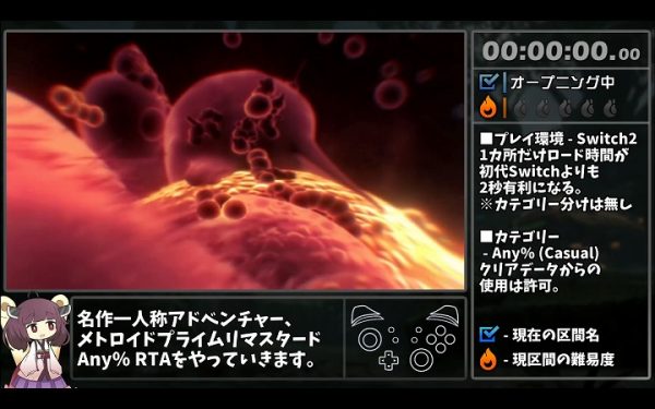 Any%RTAとは達成度を問わず、目標到達までに要した時間の短さだけを競うカテゴリで、本作の場合はサムスの操作が可能になったタイミングからラスボス撃破までを計測する。