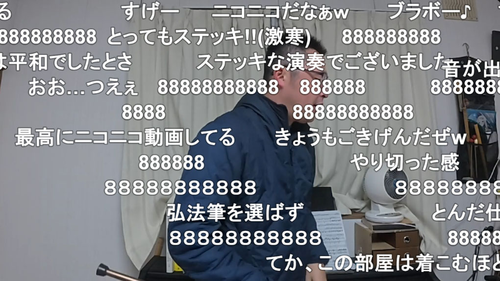ですが相当な体力を使うのか、演奏が終わると983(キュッパさん)さんは疲れた顔で大きなため息をつきます。その素晴らしいパフォーマンスに、画面は拍手を示す「88888」のコメントで埋め尽くされます。