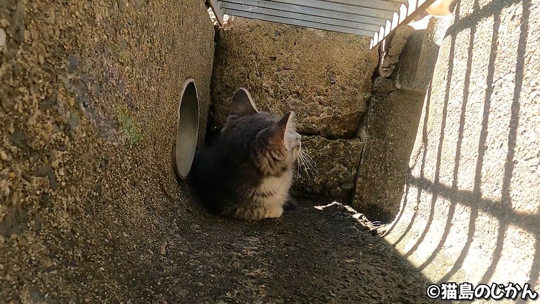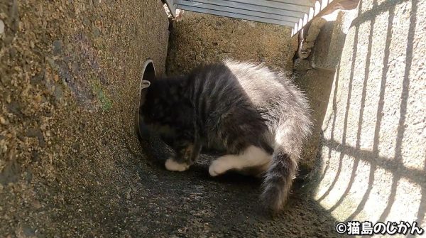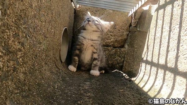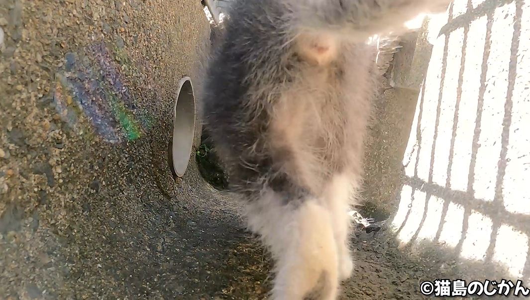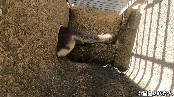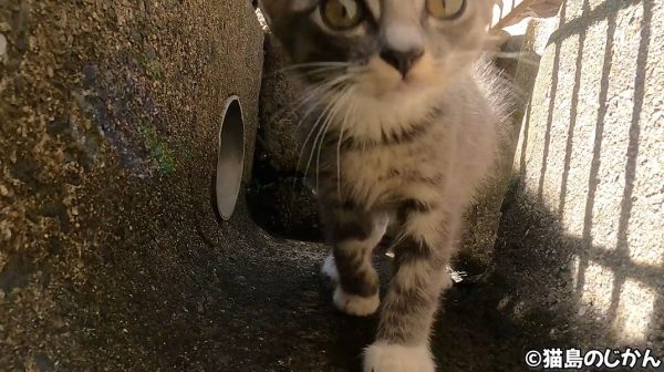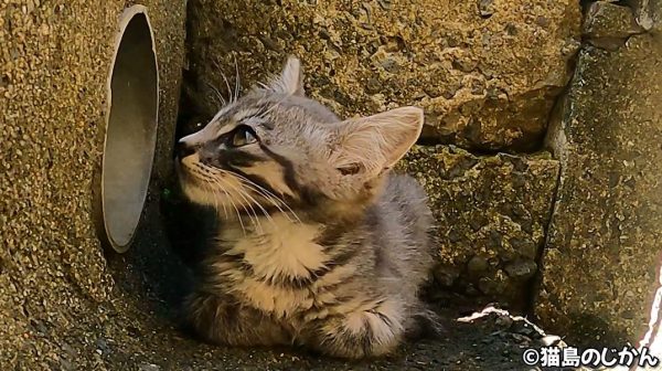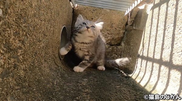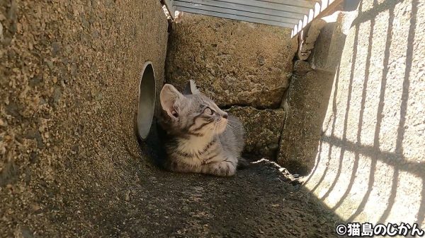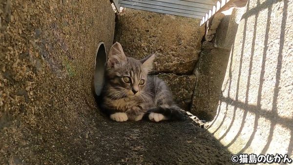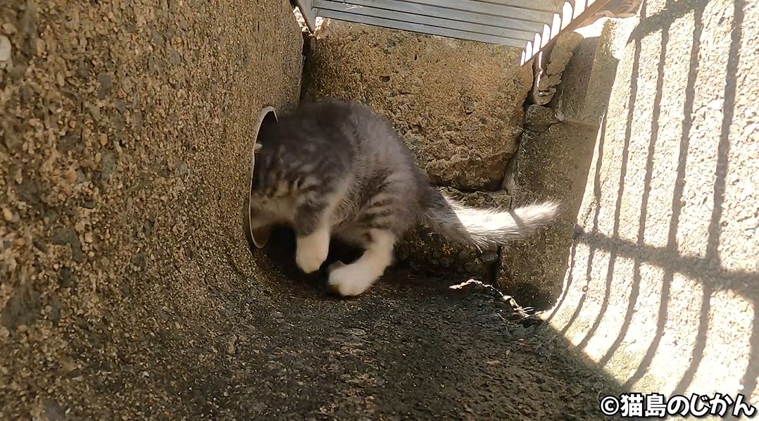 何かを察知して子猫ちゃんが横の穴に駆け込みました!
