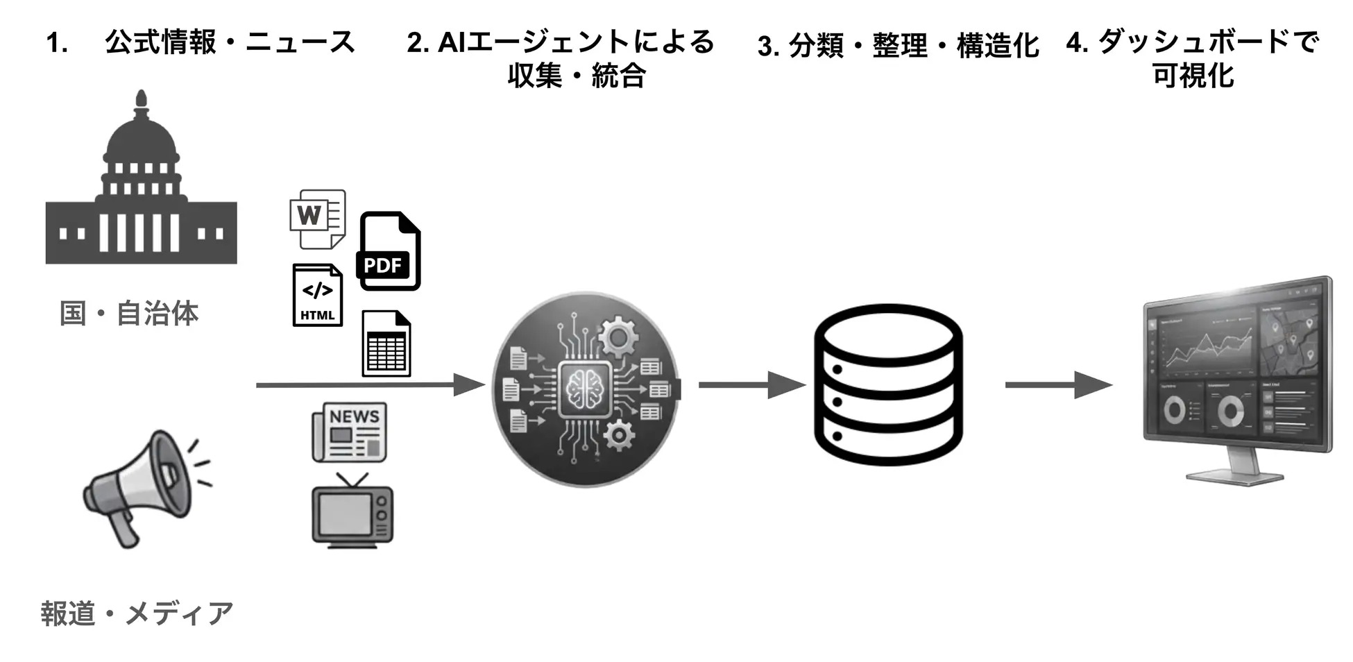 • 独自のAIエージェントが自治体等の公式発表およびニュースを自動収集し、ダッシュボードへ最新情報を反映。