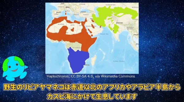 野生のリビアヤマネコは赤道以北のアフリカやアラビア半島からカスピ海にかけて生息。赤道以南のアフリカの集団は遺伝的に異なり、亜種または別種として扱われることがあるそう。