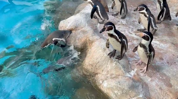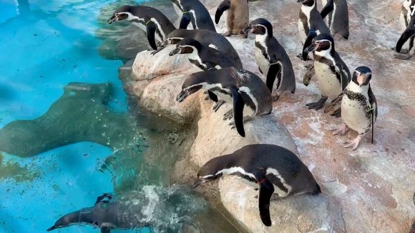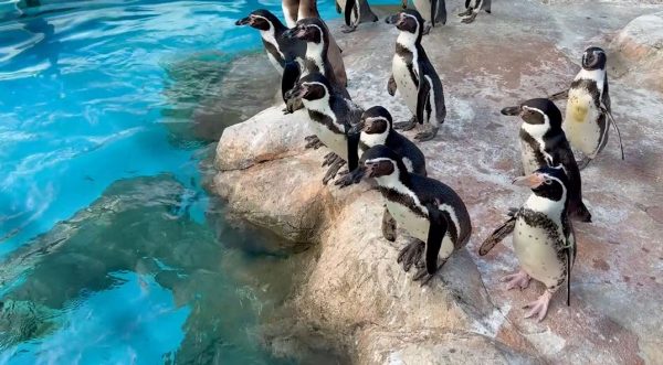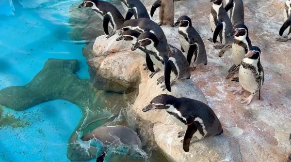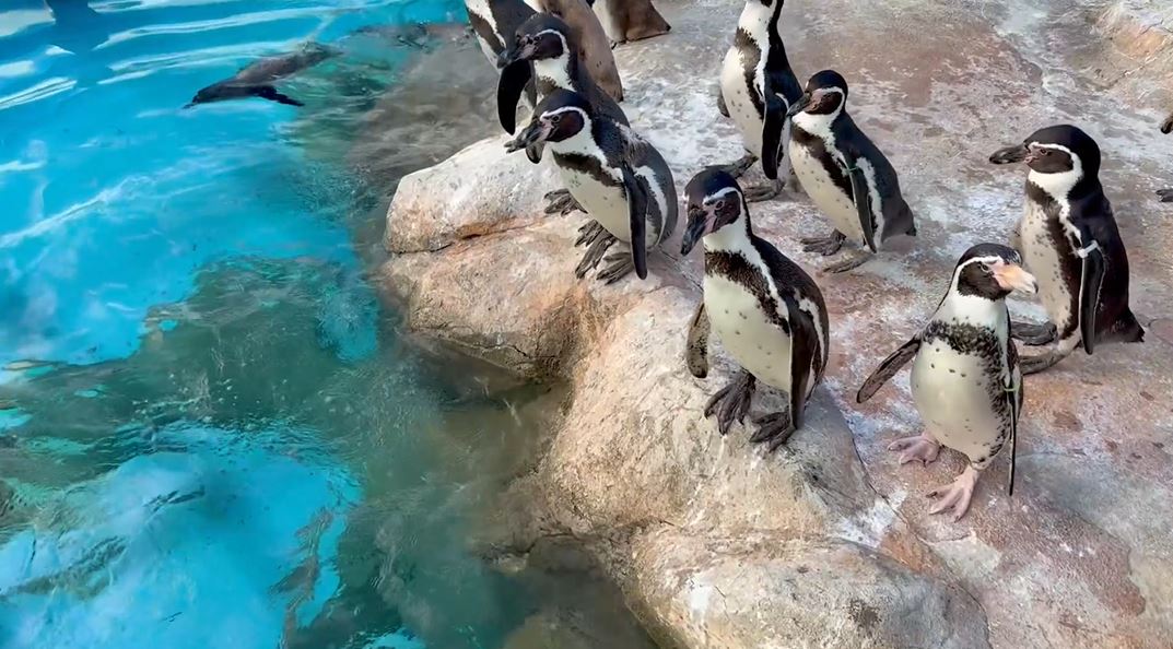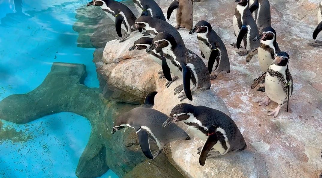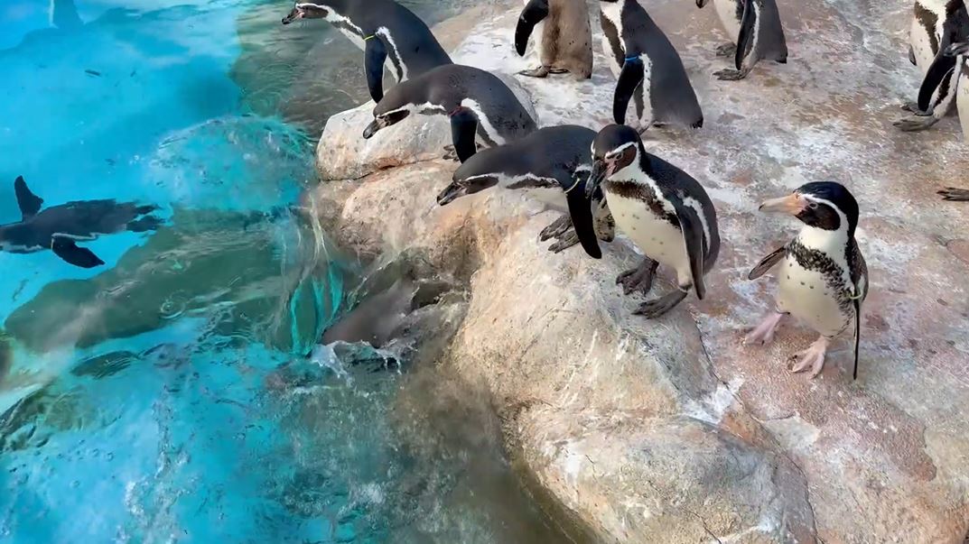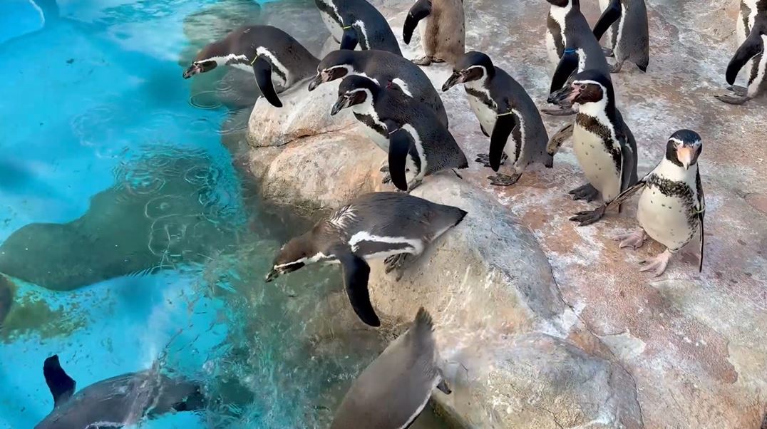 ファーストペンギンの飛び込む瞬間を捉えてみた! プールをのぞき込むペンギンの群れの中に勇敢な1羽が登場