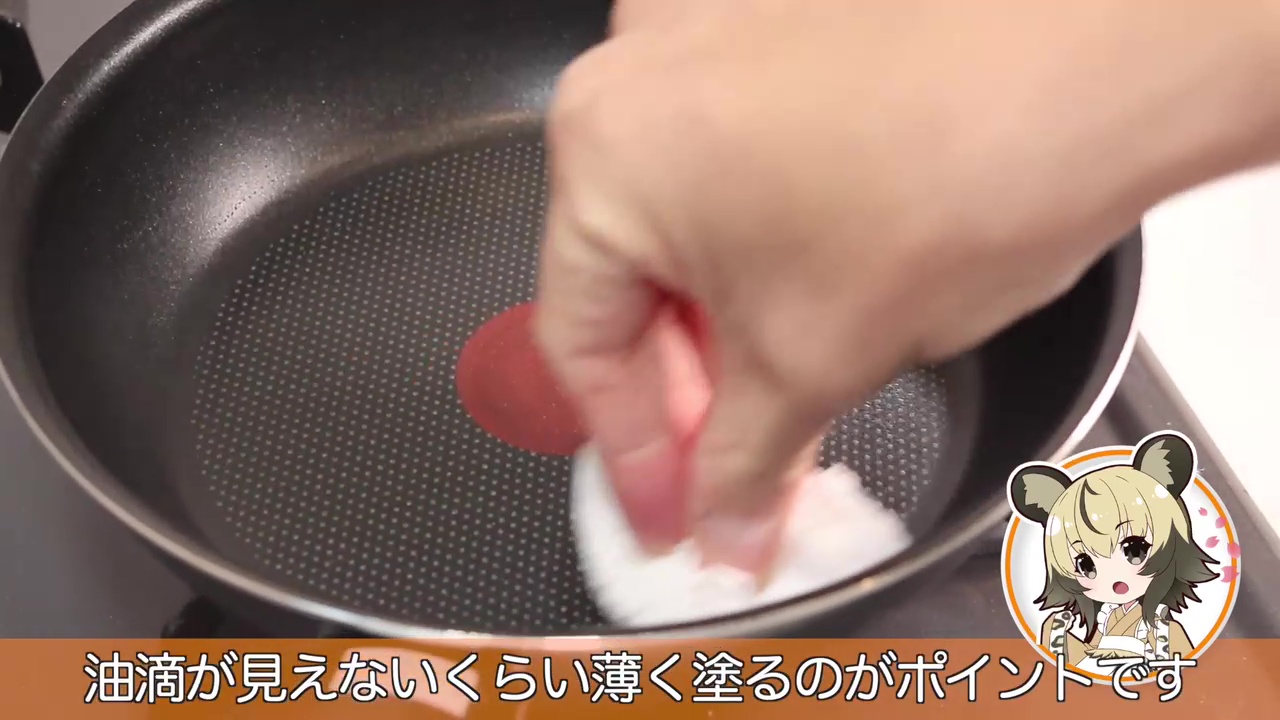フライパンを用意します。火加減は弱火。油は薄くペーパーで広げ、油滴が見えないくらいに薄く塗るのがポイントです。油滴が見える状態で焼くと、まだら模様になってしまいます。