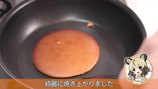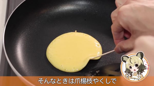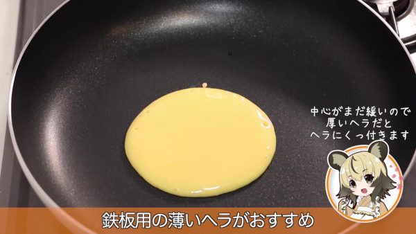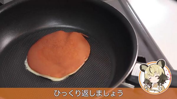 中火で180~200度にします。本来は温度が安定しやすい厚めのフライパンやホットプレートが作りやすいのですが、りおんさんは難しい薄いフライパンで挑戦します。生地を流し入れ、表面に気泡が見えたらすぐに返します。