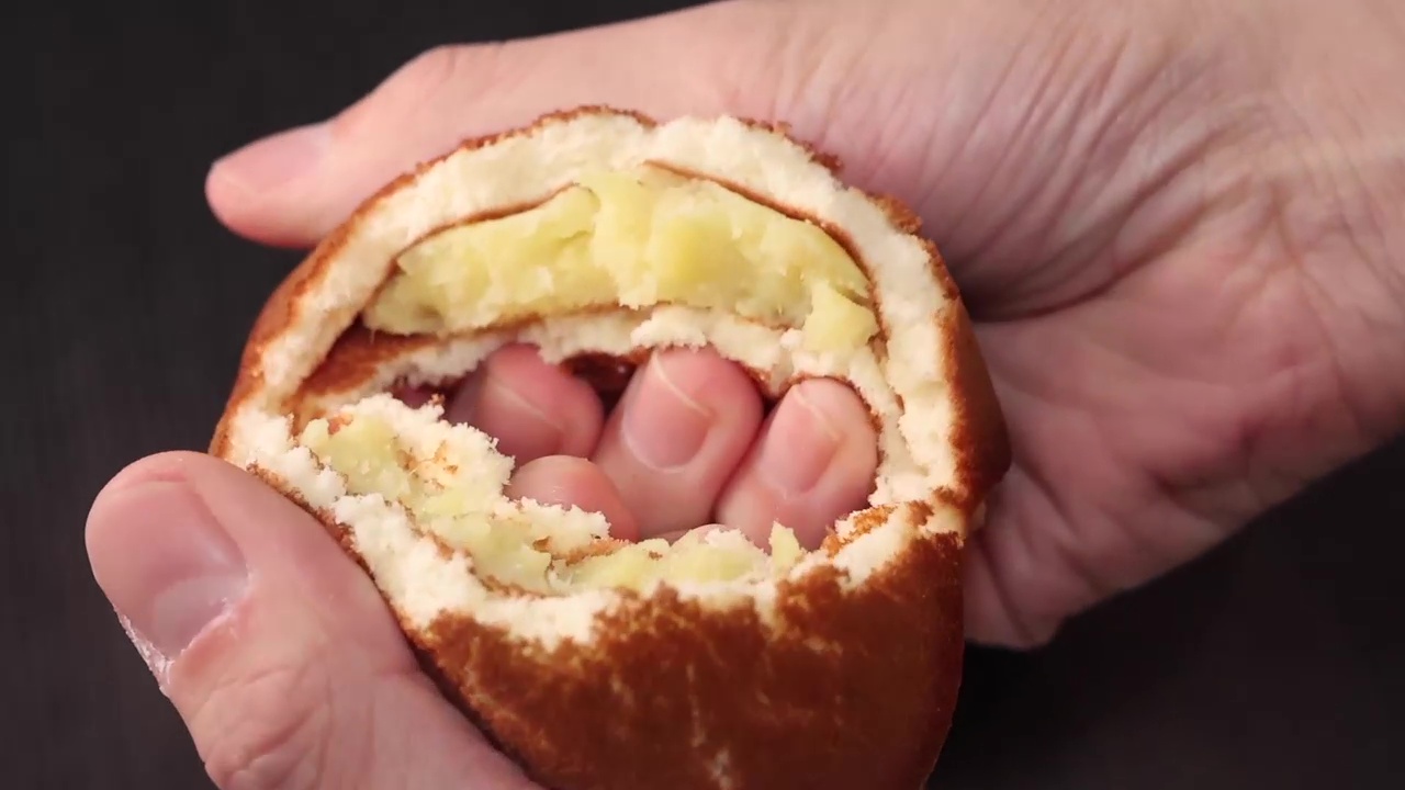 焼き上がったらさつまいも餡をたっぷりはさんで完成です。断面を見ると生地はふんわり。さつまいも餡のしっとりとホクホクした食感が、やさしい甘さで味わえるそうです。りおんさんは温かいほうじ茶を合わせ、ゆったりとした時間を楽しみました。