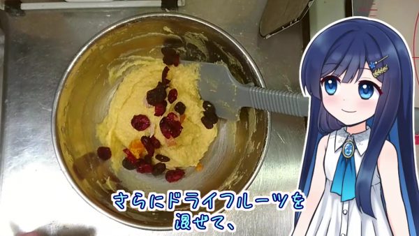 続いて“クレームダマンド”作り。ボウルでバターを練り、砂糖、卵、アーモンドプードルを加えて混ぜ、クリーム状になったらドライフルーツを混ぜます。これも冷蔵庫に入れておきます。