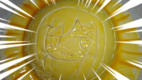 ケーキ周囲にフォークで模様をつけていきます。中央部はイラストを描きます。竹串でアタリを取ったあと、ナイフで切り込みを入れました。