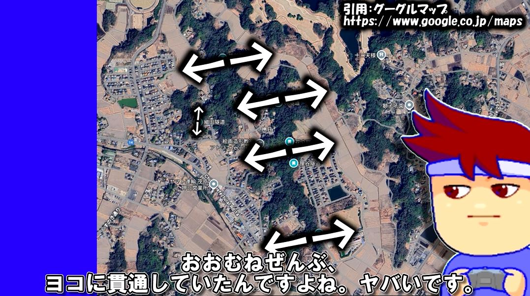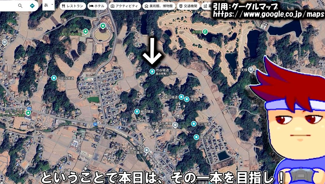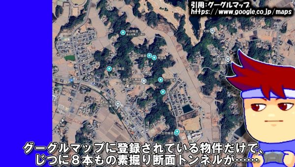グーグルマップに登録されているだけで、8本もの素掘り断面トンネルがあるのだとか。しかもそのほとんどは横に貫通しているのだそうです。ウスイさんによると房総半島はやたら素掘りトンネルが多い場所。それでもこの密集率はすごいとのことです。