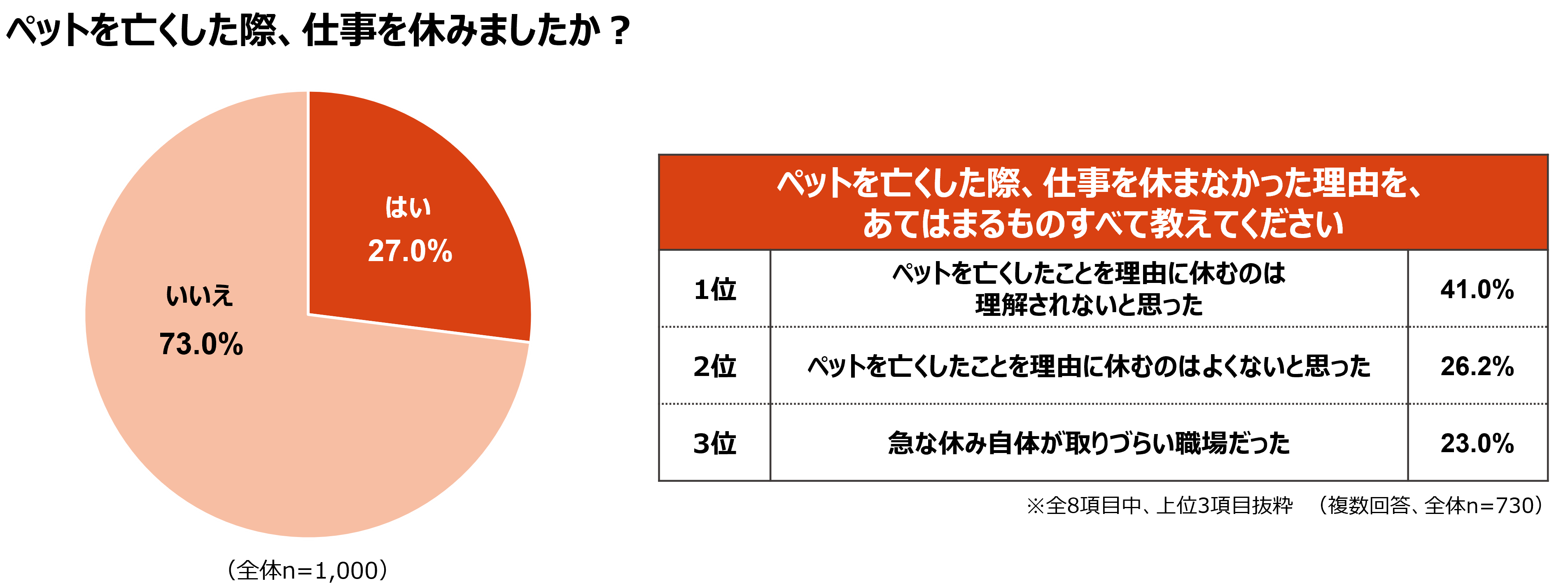 本調査によると、ペットを「家族」と捉える人が約6割に達する一方、忌引などで仕事を休まなかった人が73.0%に上ることが判明。