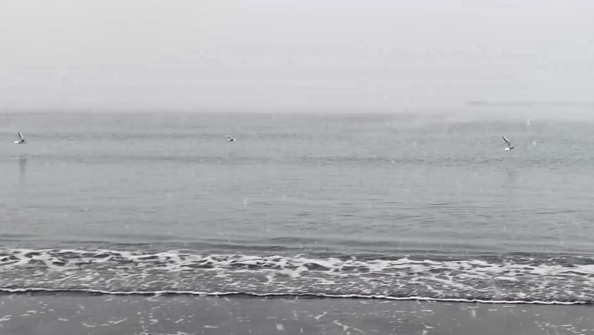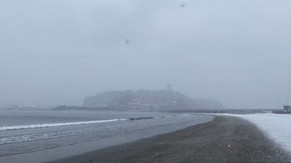 きっと銀世界が待っているはず、と海へ。普段は真っ黒の海岸は白く、江の島は雪で霞んでよく見えません。