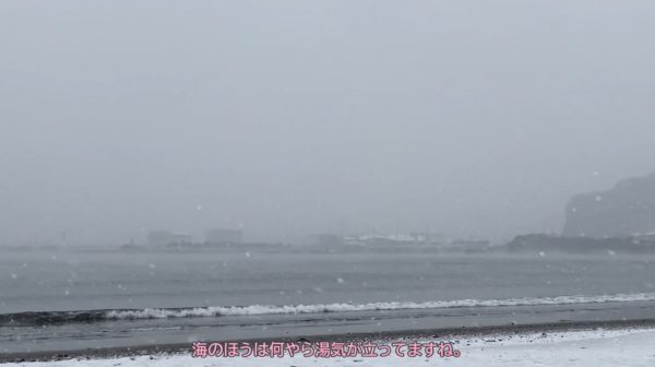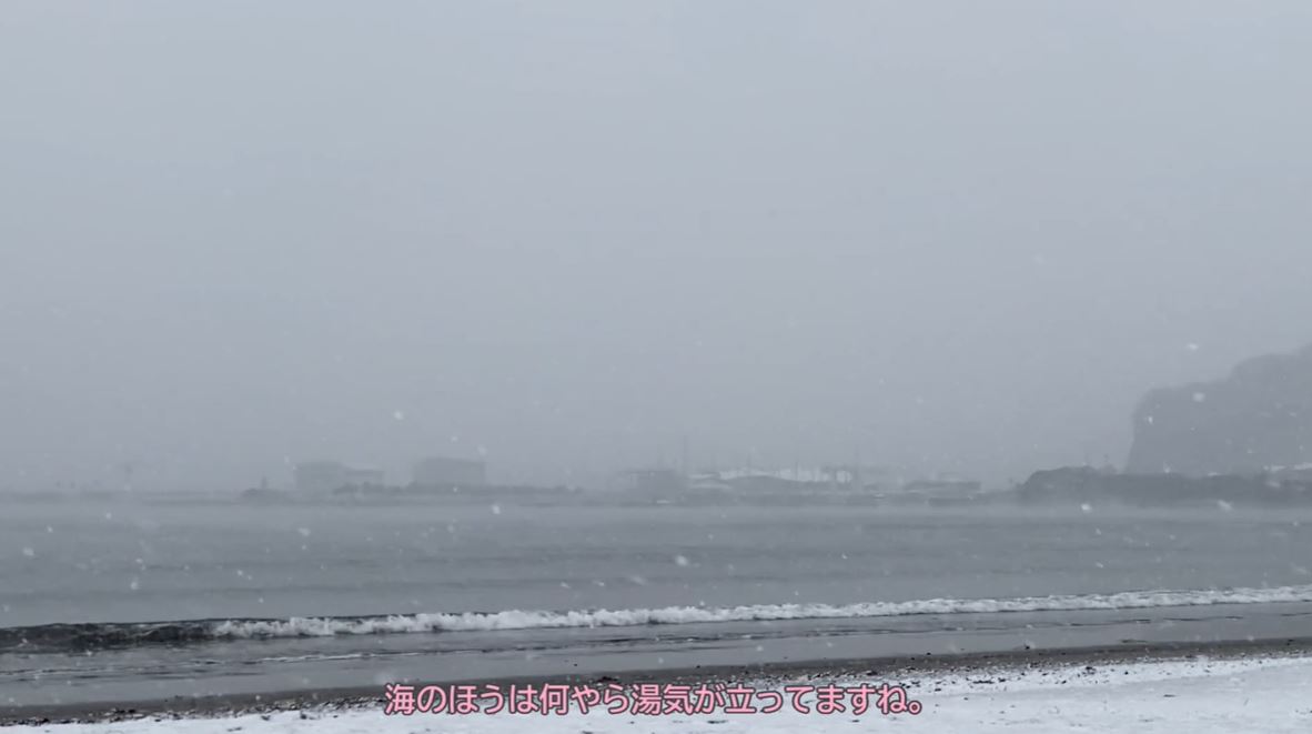 貸し切り状態の海岸に降り立って景色を見ていると、海の方は湯気が立っているように見えたそう。気嵐(けあらし)という現象ですね。