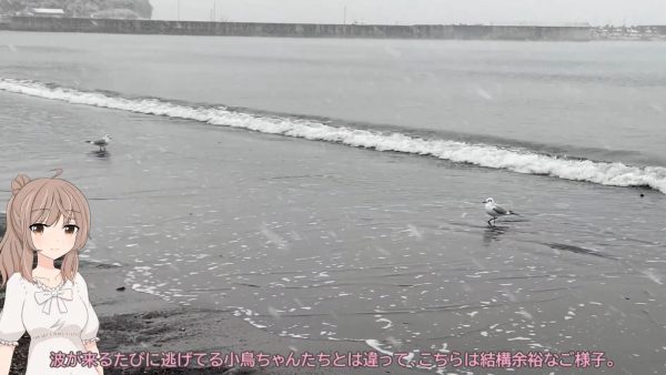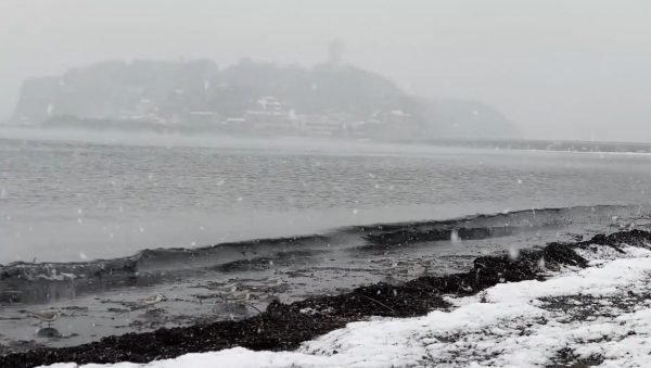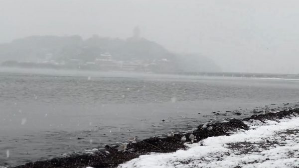 雪の中の江の島を見たくなって誰もいない海岸へ! 波と戯れる鳥たちを見た後は、江ノ電に乗って非日常の景色を堪能する