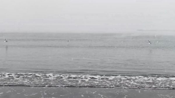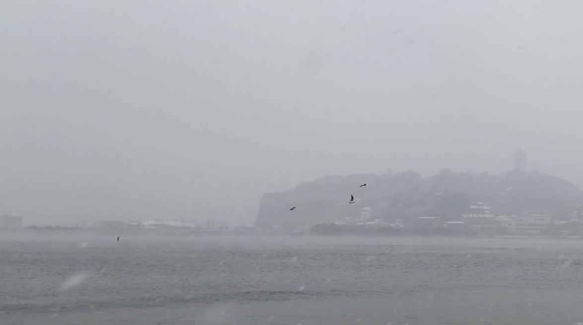寒くないのかなーと見ていると、飛び立ったカモメたち。その姿が雪に煙る江の島の方へと消えてゆきます。