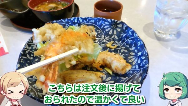 揚げ置きしていたらしいサツマイモのかき揚げが2個と、揚げたてのエビは3匹。普段エビを使う時は大きいけれど、今日は小さいので3匹なのだとか。から揚げ寄りの天ぷら感で、こちらも家庭的な美味しさだったそうです。
