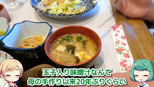 自分で作るお味噌汁の具材は1つか2つが好みですが、こちらのお味噌汁は具沢山でも美味しいと感じたそうです。卵入りのお味噌汁は母の手作り以来の20年ぶりだったとか。心が落ち着く味わいとのこと。