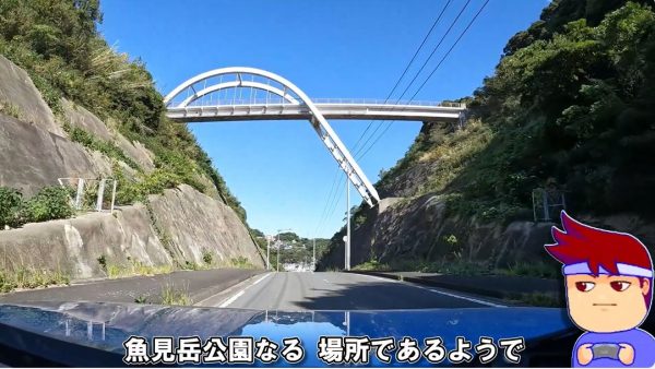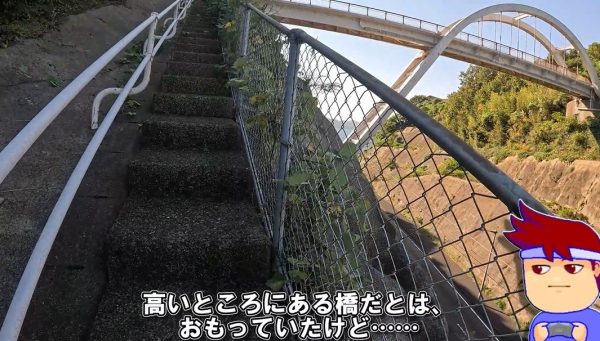 あとで調べたところによると、橋の東つまり画像の右の山の中に魚見岳公園という場所があり、展望台などもあるそう。橋へ向かう途中に見つけた階段は、橋および展望台へ向かうものだったそうです。