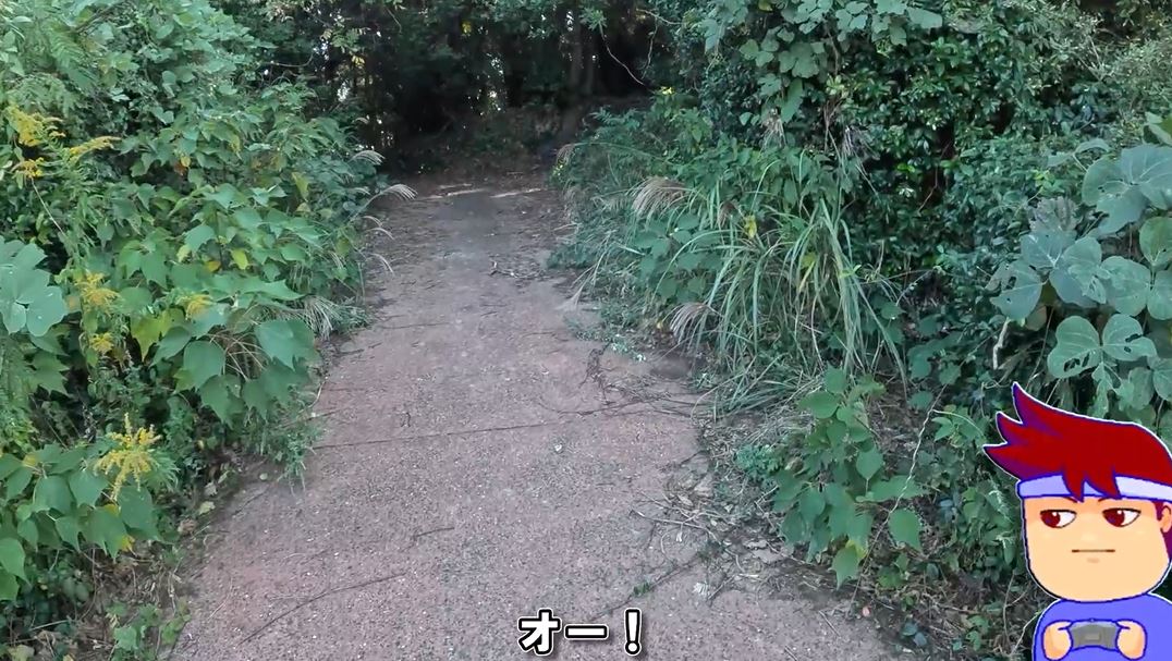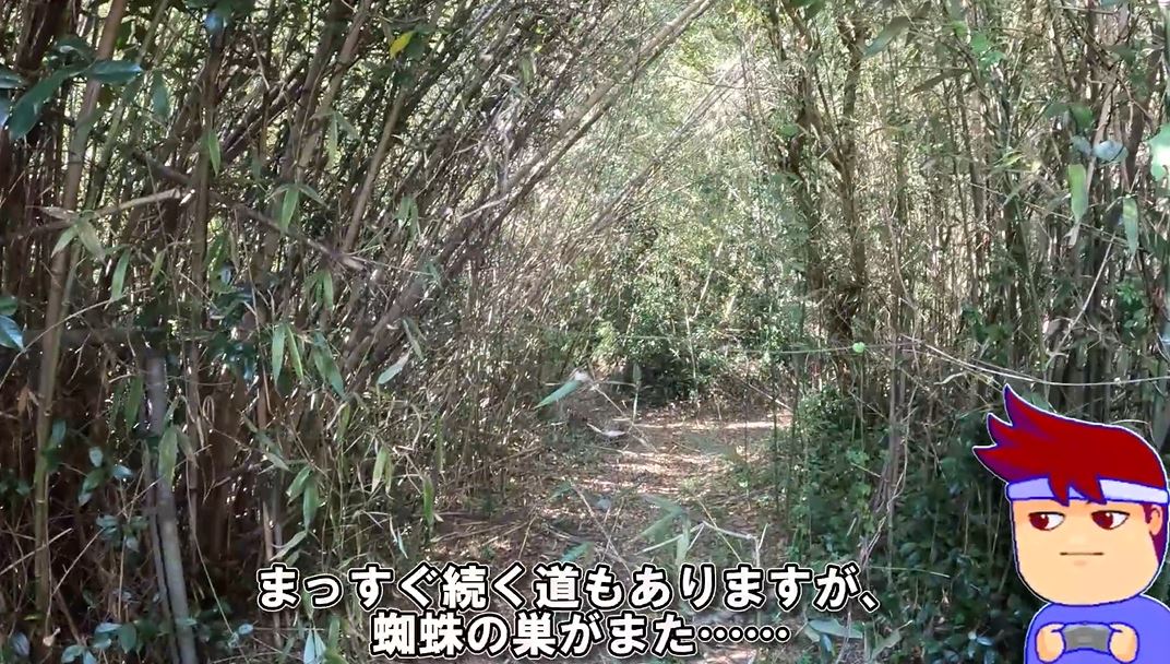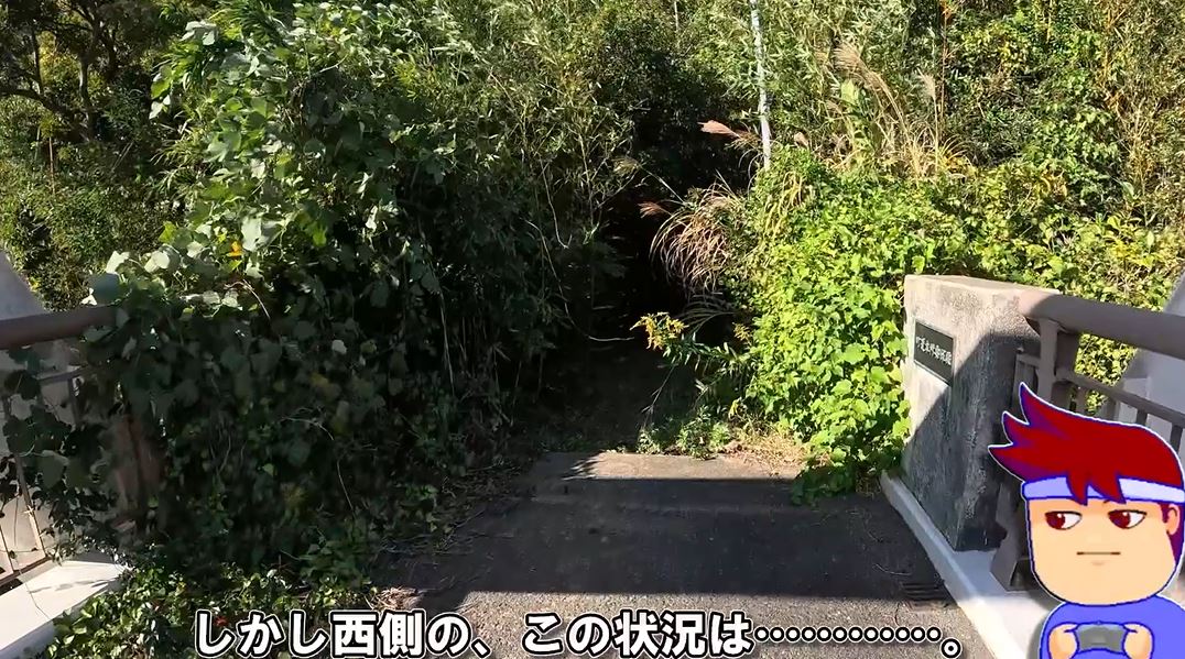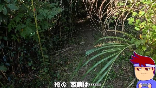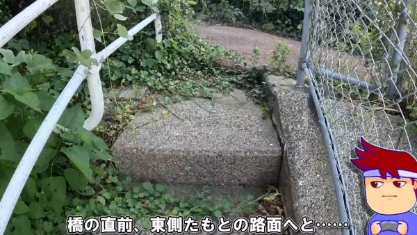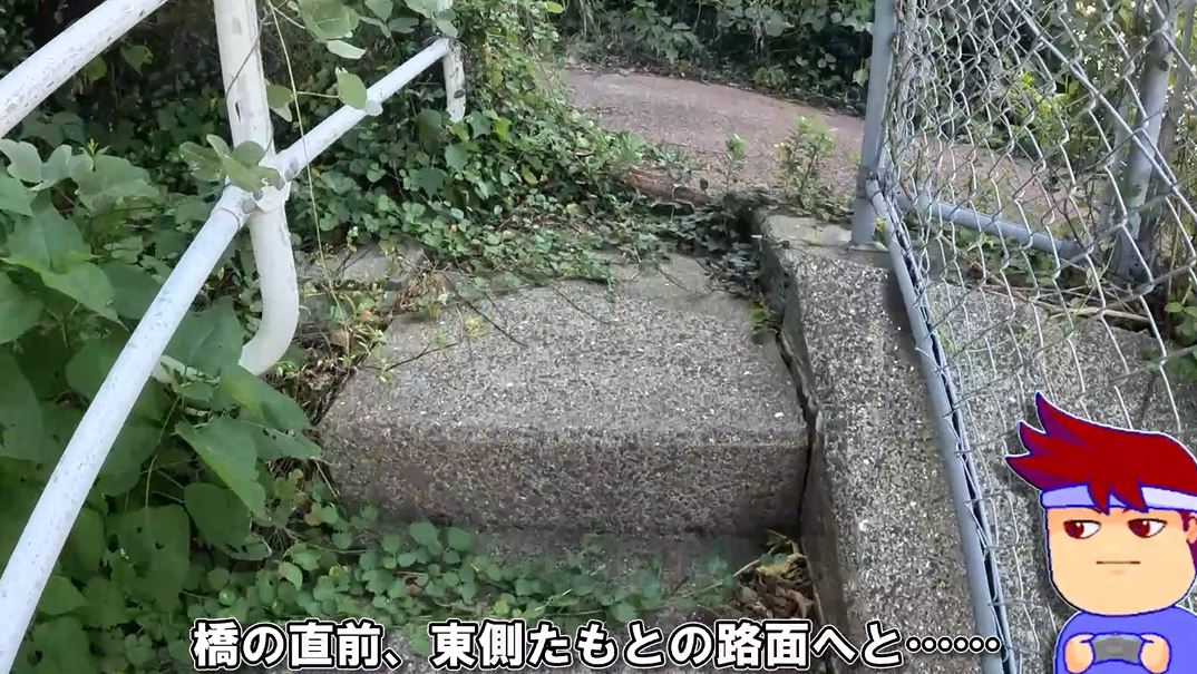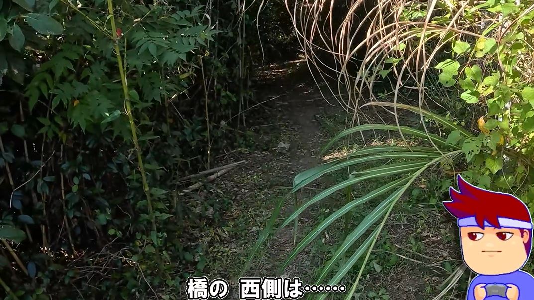 橋の西側は草が生い茂っています。まっすぐ続く道もありますが、蜘蛛の巣が多く進むのを断念。