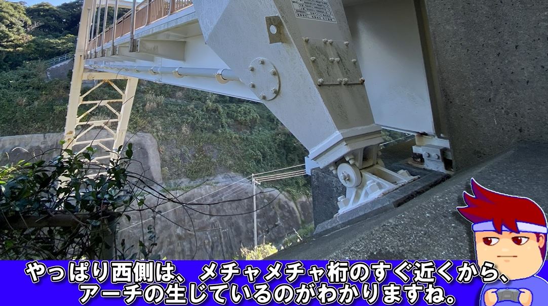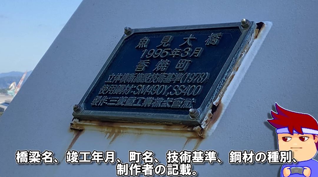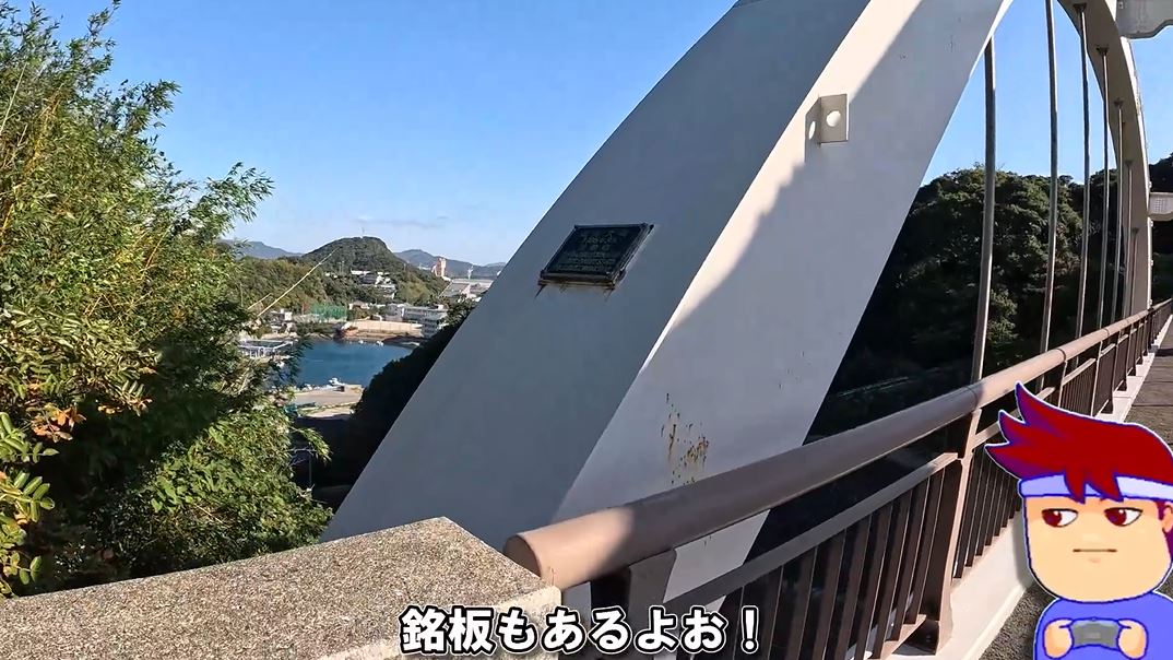アーチには橋梁名、西暦での竣工年月や町名など各種情報がまとめられた銘板が。製作が三菱重工ということは、昨日通った一大工業地帯で作られたのでしょうか。