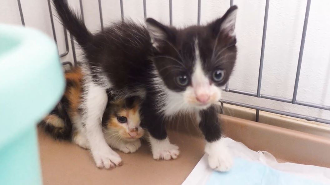 白黒と三毛の兄妹子猫を保護預かりした投稿者のねこかますさん。最初は2匹そろってケージのすみっこで警戒の体勢でしたが……