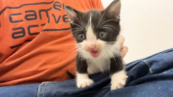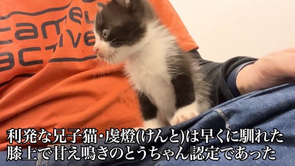 兄子猫の虔燈(けんと)ちゃんは早くに慣れ、膝上で「ミュー」と甘え鳴きするほどになりました。