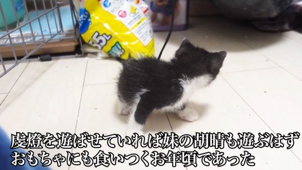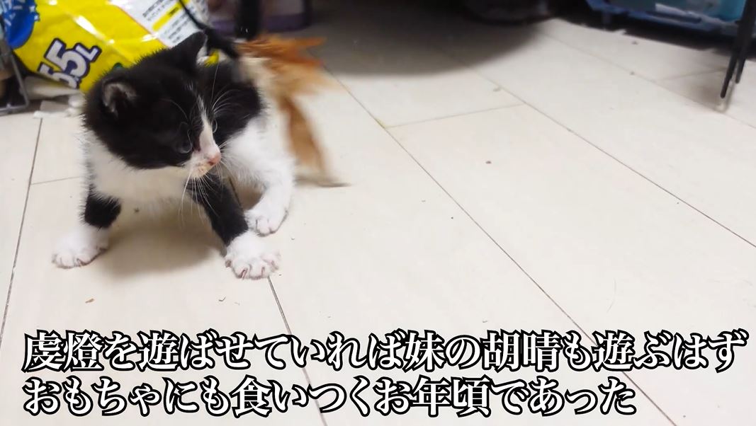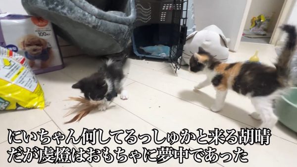 虔燈ちゃんを遊ばせていれば、妹子猫の胡晴(こはる)ちゃんもオモチャに食い付くはず、とねこかますさん。