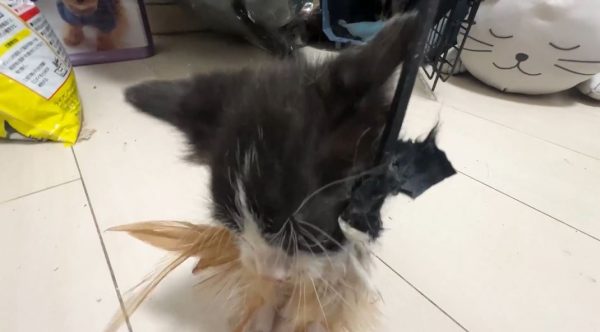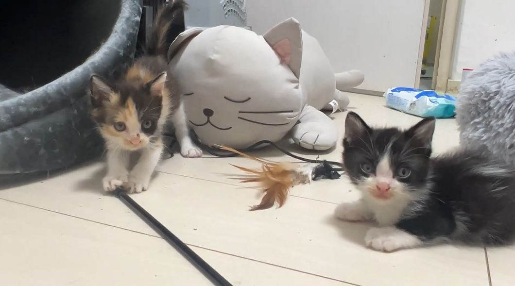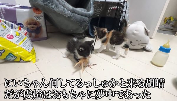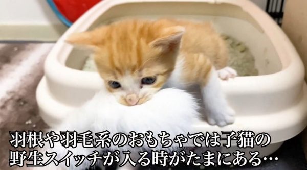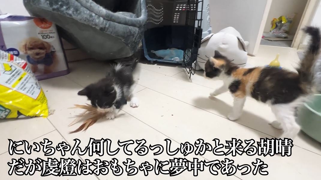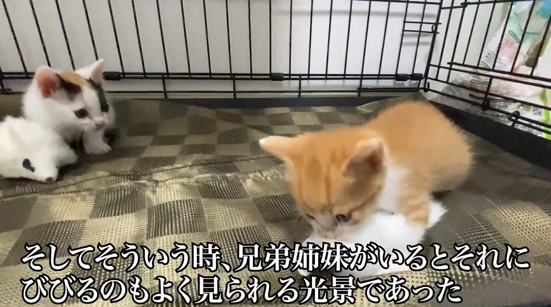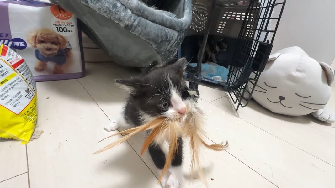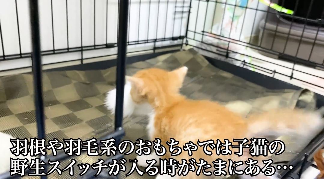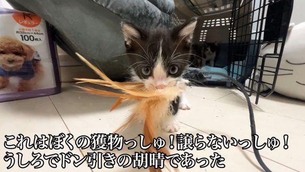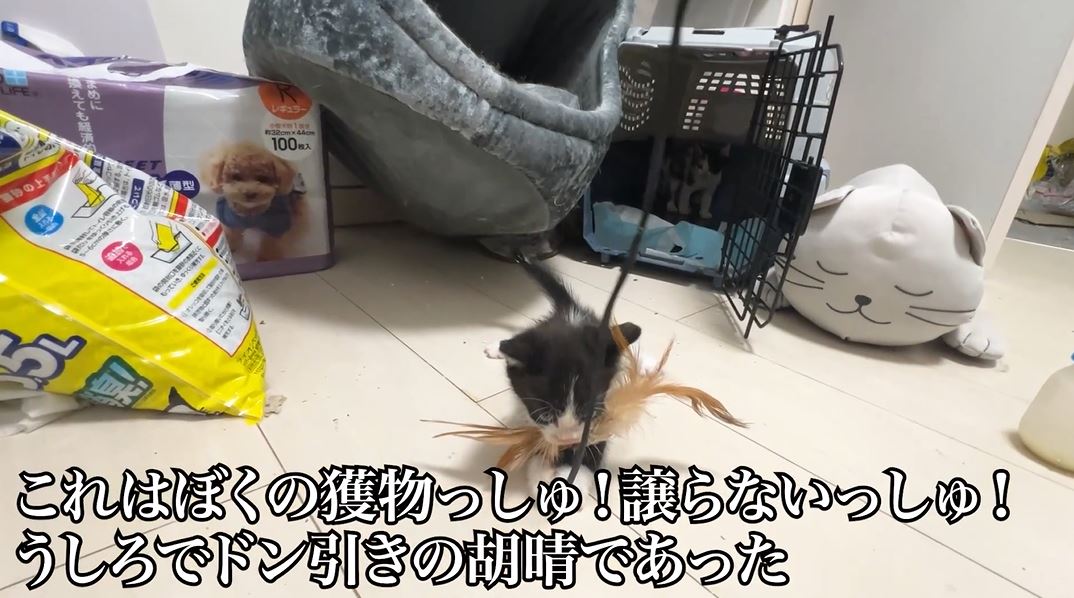 意気揚々とオモチャをケージに運んだ子猫ちゃんが、夢中でオモチャに喰らい付いています。ねこかますさんによると、羽根や羽毛系のオモチャで子猫の野生スイッチが入るのはたまにあるとのこと。肉などの食べ物で発動することもあるとか。そしてこういう時に兄弟姉妹猫にビビられるのはよく見られる光景なのだそうです。