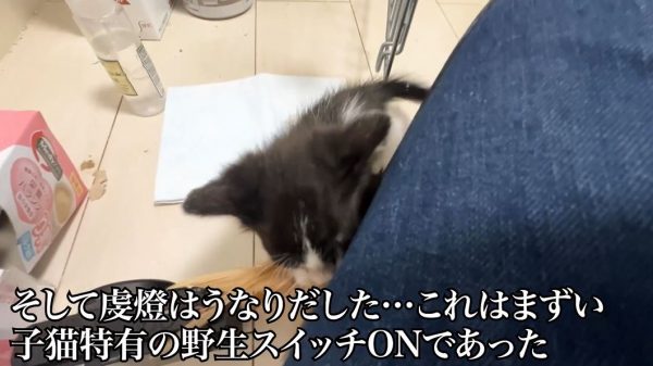 うなりながらオモチャに喰らい付く様子を見たねこかますさんは「これはまずい」。子猫特有の野生スイッチが入ってしまったそうです。
