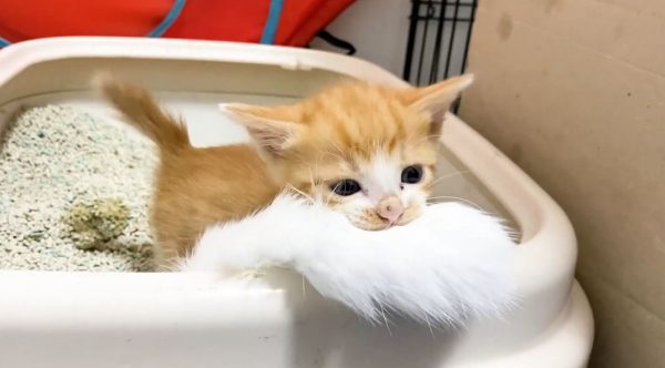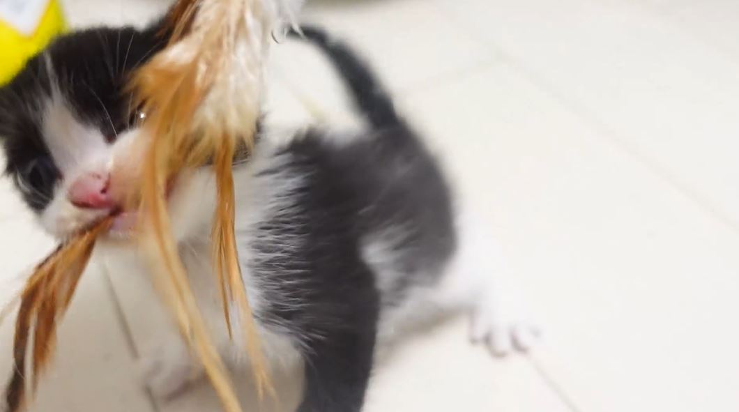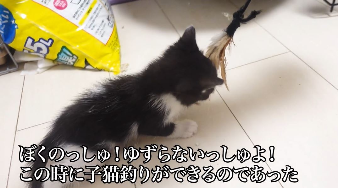 子猫ちゃん、ふわふわオモチャで野生に目覚める! 「絶対離さないニャン」と踏ん張って“子猫釣り”状態に