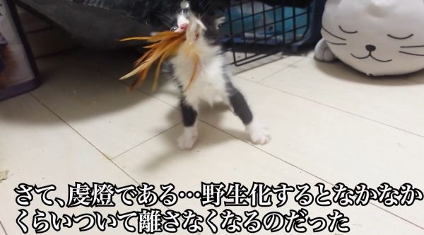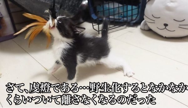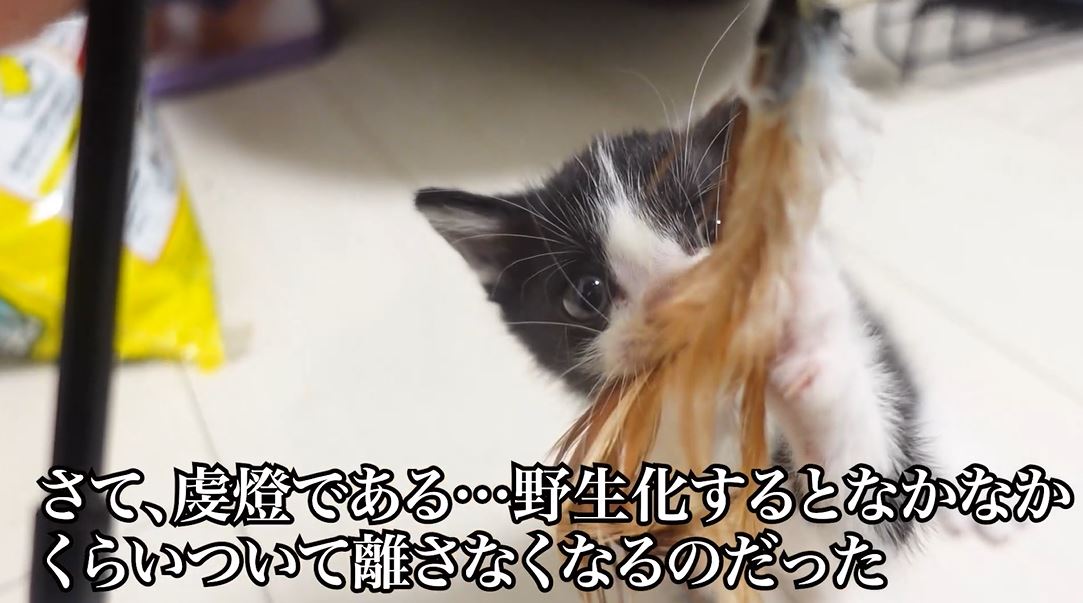 虔燈ちゃんの様子はというと、野生化した子猫あるあるとして喰らい付いてオモチャを離さなくなっています。