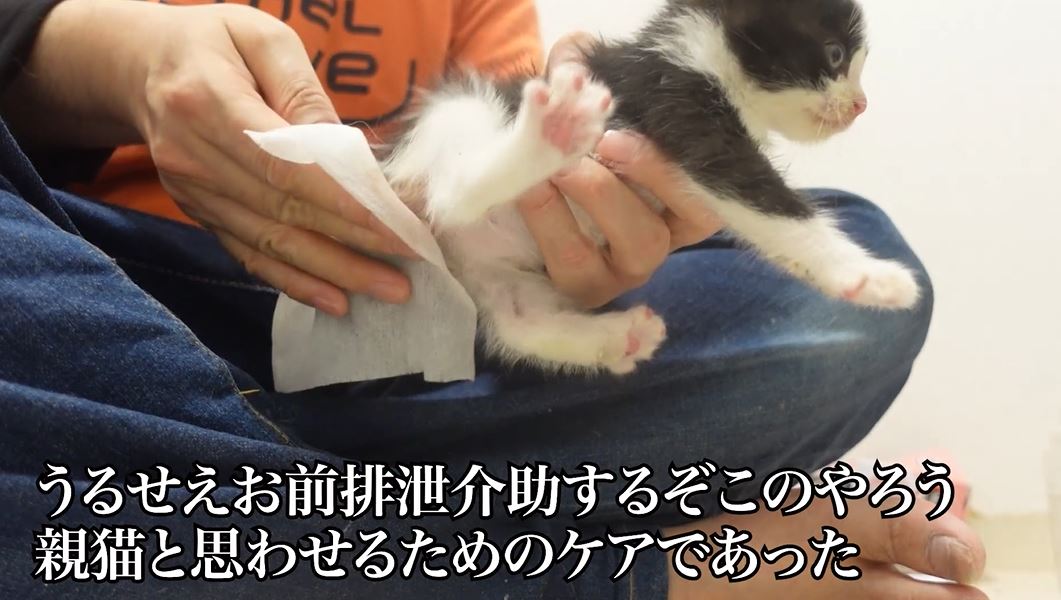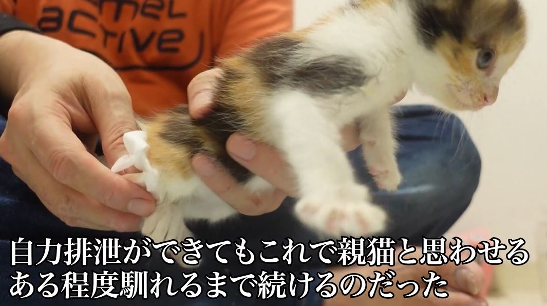 続いては胡晴ちゃんのケア。自力排泄ができても、ある程度慣れるまで続けるそうです。こうして親代わりとして信用を勝ち取って行くのですね。