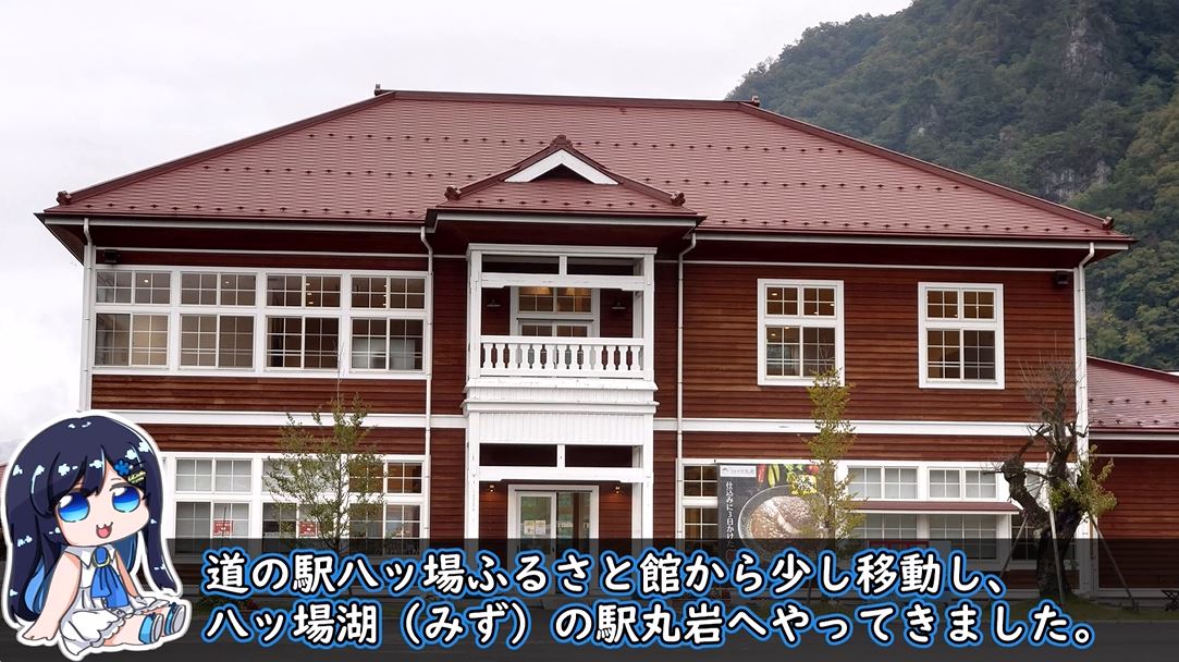 昼食を済ませたところで水陸両用バスの乗車場所へ。八ッ場湖(みず)の駅丸岩は、旧長野町役場庁舎を再現したもの。