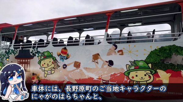 待っていると水陸両用バス「にゃがてん号」がやってきました。車体には長野原町のご当地キャラクターにゃがのはらちゃんと、東吾妻町にある天狗山がモチーフの天狗のてんちゃんが描かれています。