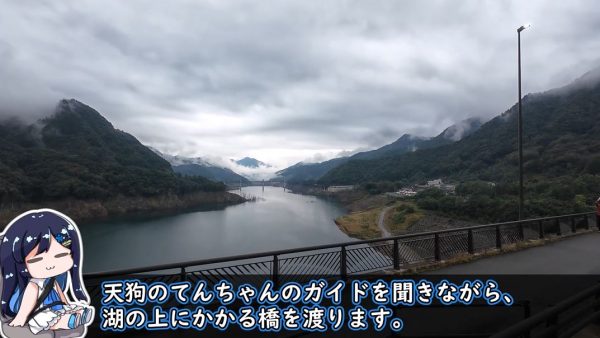 ダム湖のスプラッシュポイントまでは、天狗のてんちゃんのガイドを聞きながら陸上バスモードで向かいます。