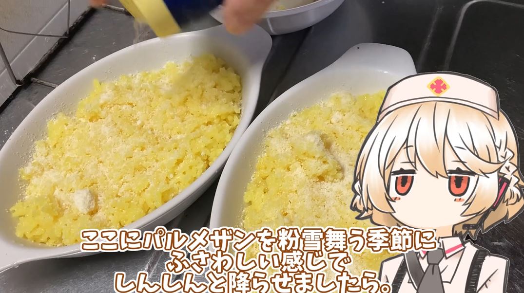 グラタン皿にライスを盛り付けたら、パルメザンチーズを粉雪舞う季節にふさわしい感じで振らせました。