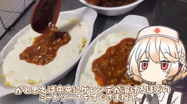 その上へホワイトソースをかけて、ミートソースを乗せていきます。