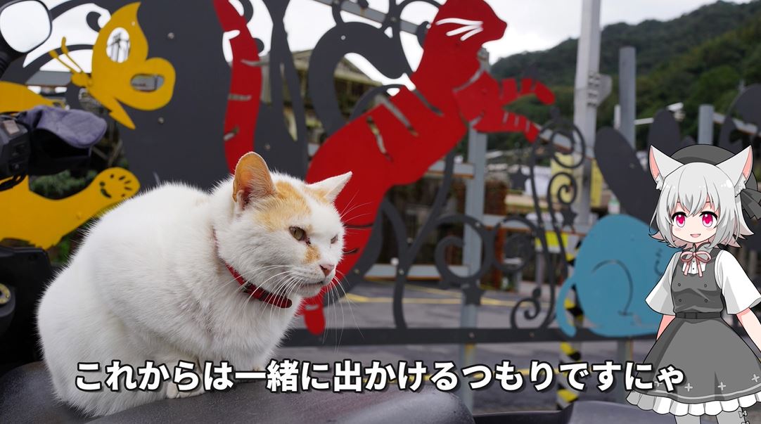 猫で彩られた地名の巨大看板の前に佇む猫ちゃんの姿がいい感じですね。