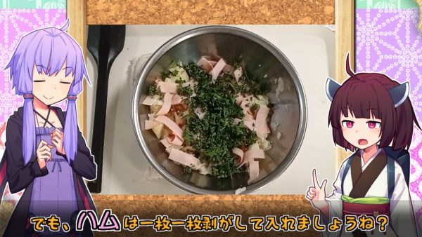 切った具材をジャガイモのボウルに投入。このときハムは一枚一枚はがすと鶏ささみさん。