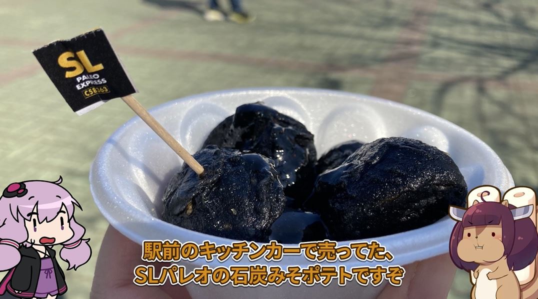 冒頭の岩畳を見たあと宝登山(ほどさん)ロープウェイにバスで行こうと思ったのですが、お昼休憩に入ったところでした。歩くためのエネルギーとして石炭みそポテトを食べる暮瀬さん。石炭入りの味噌で口周りがカールオジサン状態になったとのこと。