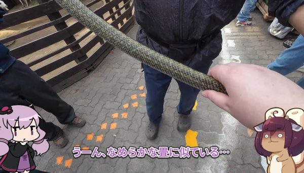 宝登山小動物公園には両生類や爬虫類の展示もあります。アオダイショウの触り心地は滑らかな畳に似ているのだとか。
