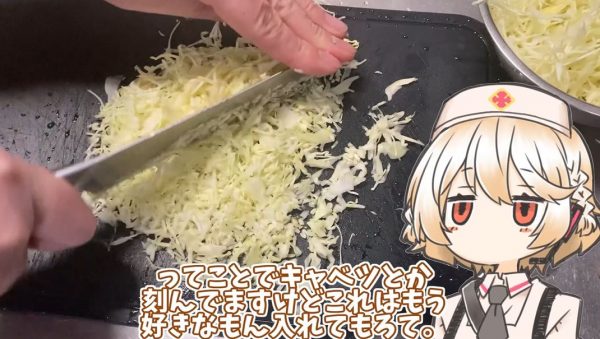 そこにあおさ以外の具材を加えました。家庭でもんじゃを作る場合は、あらかじめ具材を出来る限り細かくしておくのがオススメとのことです。