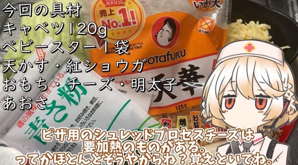 具材は好きな物を入れればいいとのことで、物体Bさんは天かすや紅ショウガの他に余ったお餅やチーズに明太子を加えるとのこと。