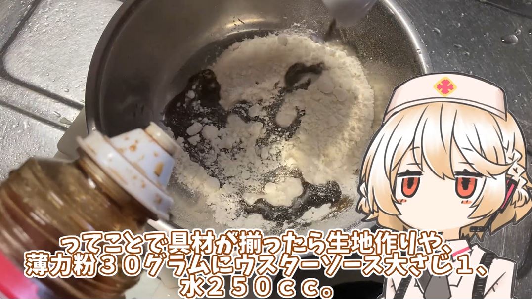 次は生地作り。薄力粉30gにウスターソース大さじ1、水250㏄を混ぜ合わせます。今回は具材にベビースターラーメンや明太子があるので、ソースは控えめでOKだとか。