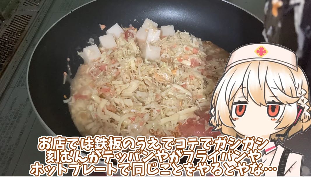 お店では鉄板の上でガシガシと具材を刻みますが、フライパンやホットプレートで同じことをするとダメになってしまいます。そのため具材をあらかじめ細かくしておくそうです。